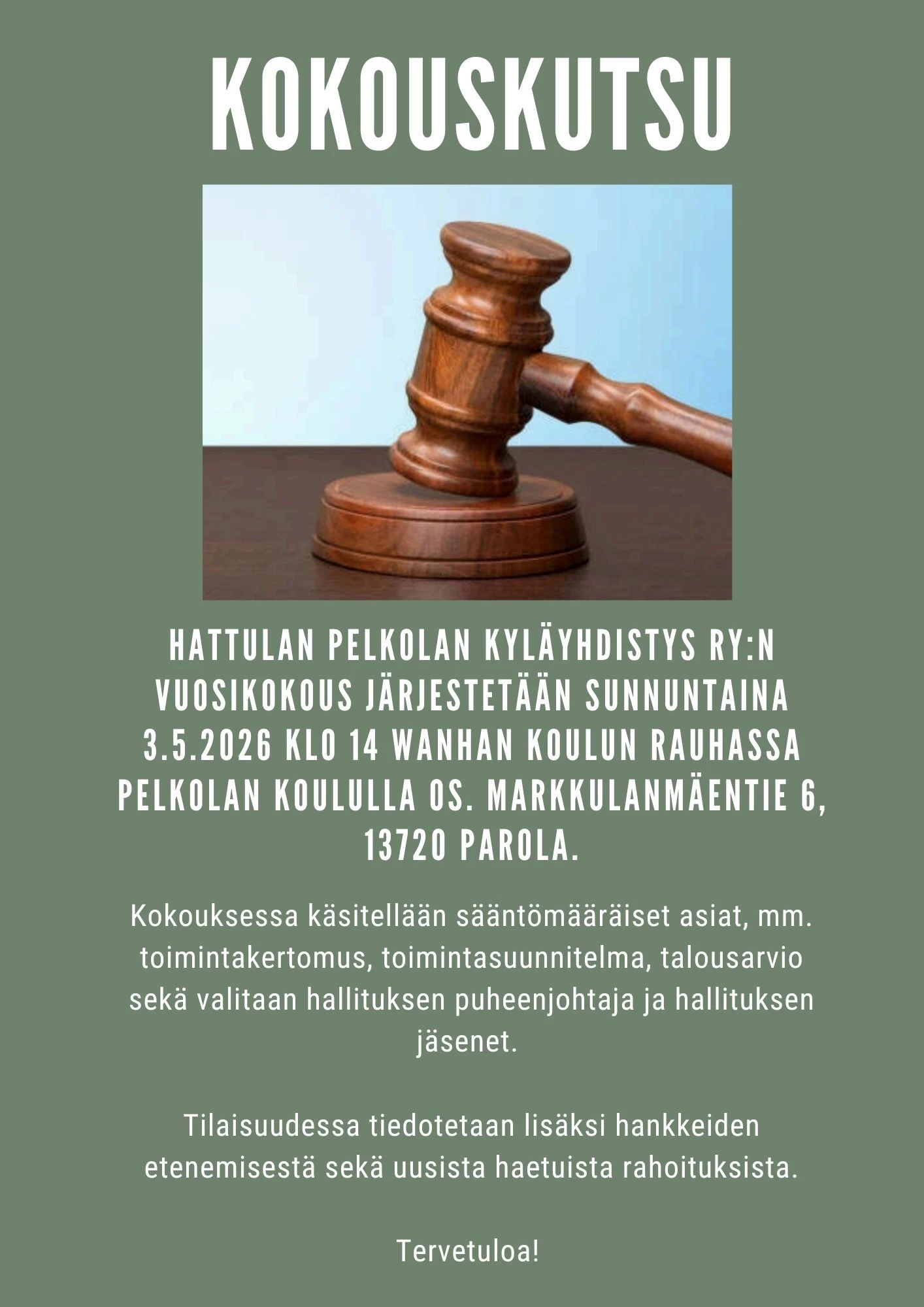 Tervetuloa Hattulan Pelkolan kyläyhdistys ry:n vuosikokoukseen sunnuntaina 3.5.2026 klo 14 Wanhan Koulun Rauhaan os. Markkulanmäentie 6, Parola.